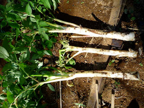 根元を囲って土を入れて育てています。